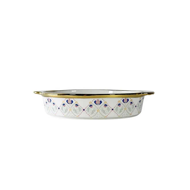 Welcome to purchase our custom baking pans. These gold-traced oval ceramic bakeware, which feature exquisite gold-rimmed decals, deliver a sophisticated and elegant appearance, durability, and wear resistance. They are dishwasher, oven, and microwave oven safe. We offer personalized personalization, single shipping, and fast proofing, making them ideal for restaurants, home bakers, and giftware.