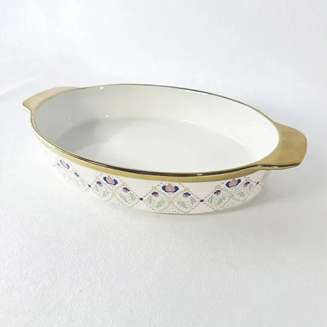 Custom Baking Pans with Handles, Gold-Traced Oval Ceramic Bakeware Wholesale
